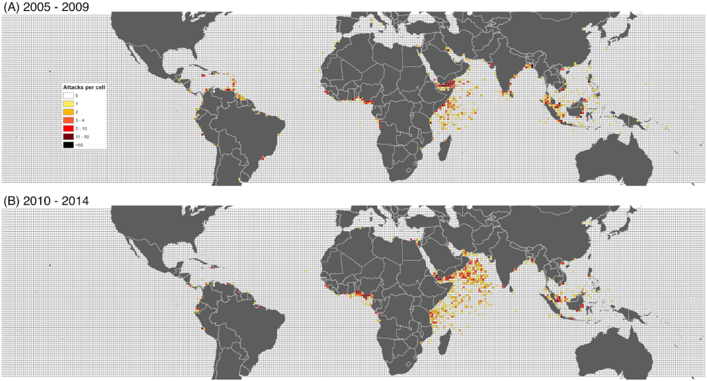 Raj M. Desai ,George E. Shambaugh : Piracy incidents from the consolidated ASAM-GISIS database, overlaid with a 1° × 1° gridded-cell layer. A: 2005-2009. B: 2010-2014. doi: https://doi.org/10.1371/journal.pone.0246835.g001