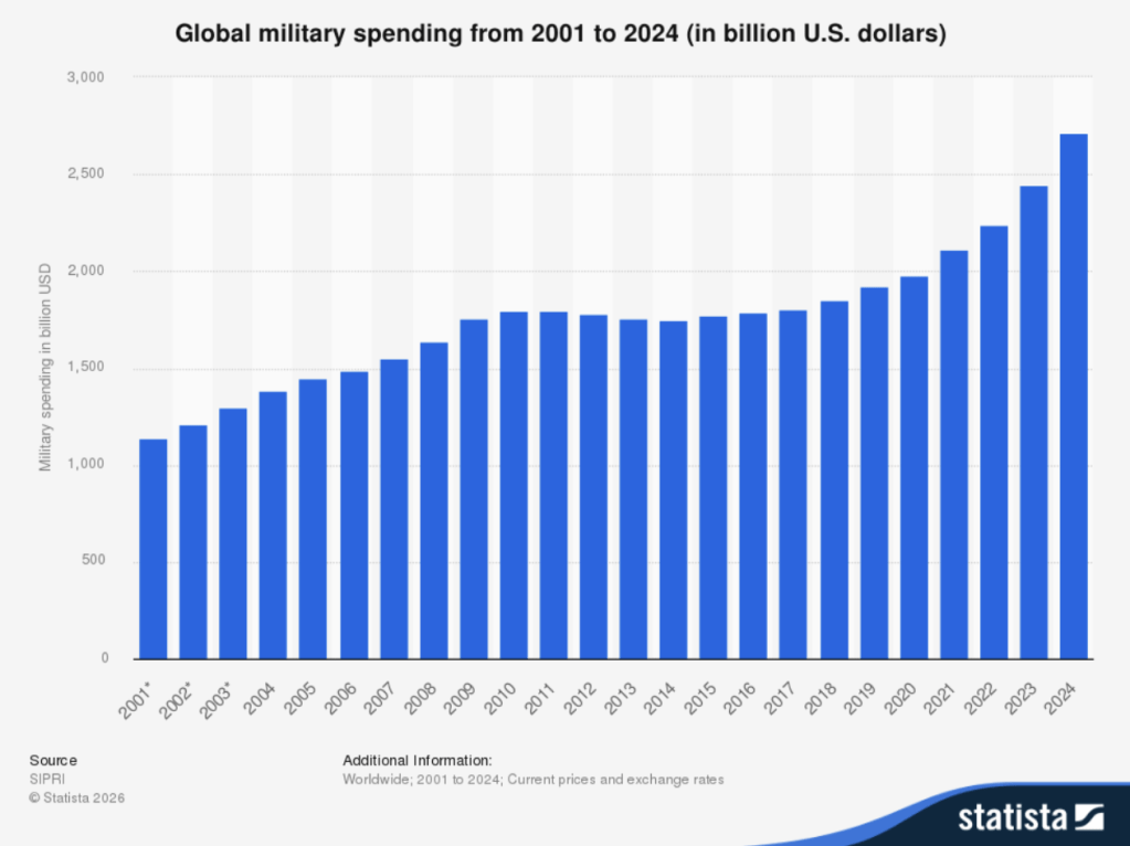 SIPRI, Global military spending from 2001 to 2024 (in billion U.S. dollars) Statista.