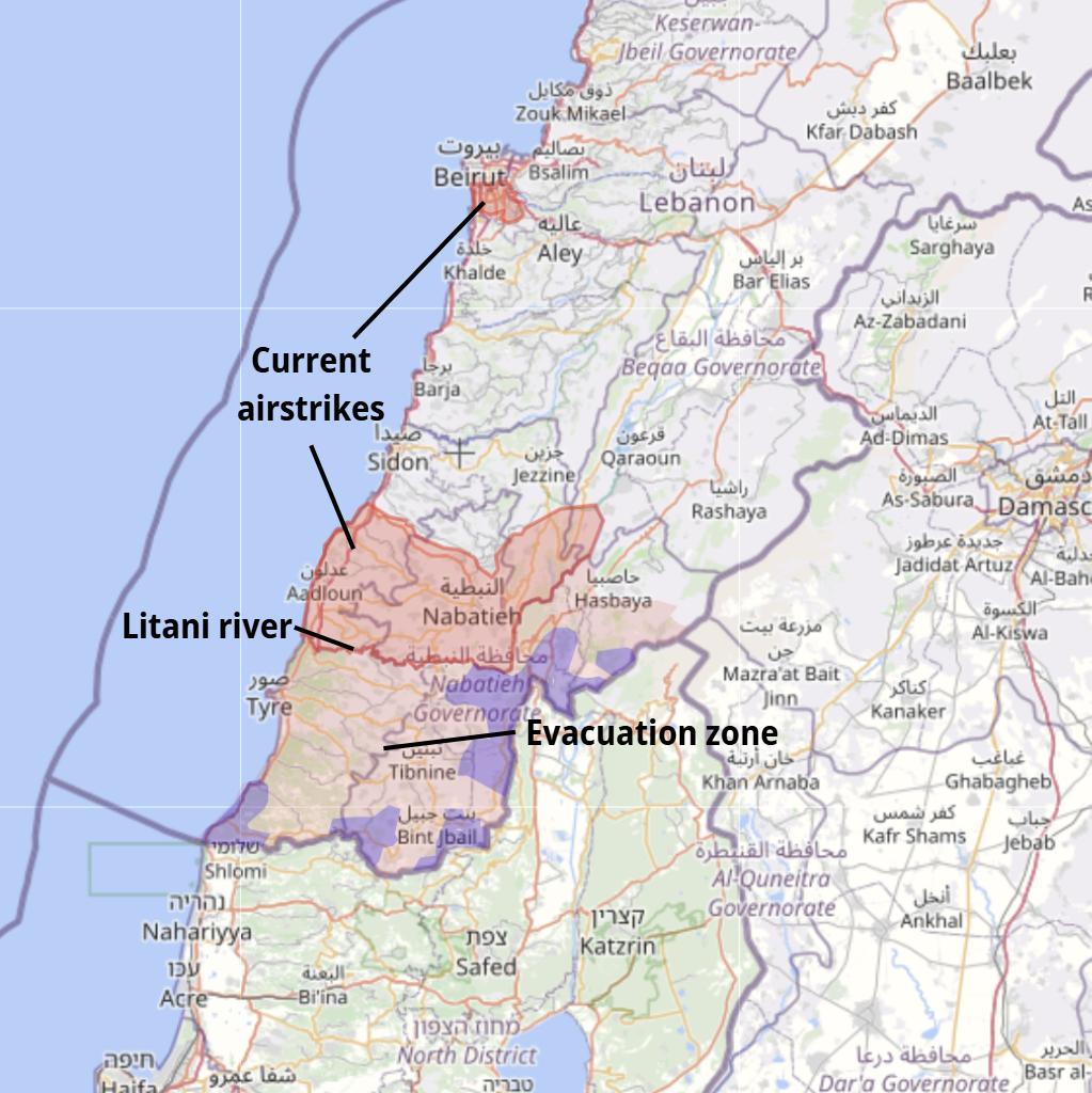 The Israel Defense Forces (IDF) keep expanding their evacuation orders, now beyond the Litani River, 30 km north of the border. The IDF’s stated goal is to seize Southern Lebanon and create a buffer zone [4]. In an attempt to isolate that part of the country, 7 bridges have already been destroyed or severely damaged by Israeli strikes.